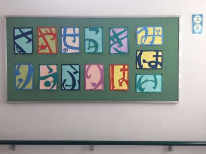 3年生が作った作品を階段踊り場に掲示しています。枠と紙を切り取ってひらがなの一字をつなげています。