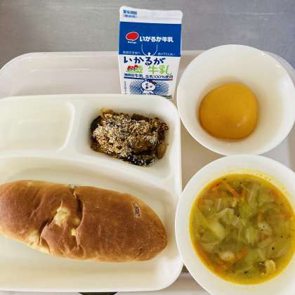 今日の献立は、おさつパン、牛乳、なすのミートグラタン、鶏肉と野菜のスープ、黄桃缶でした。