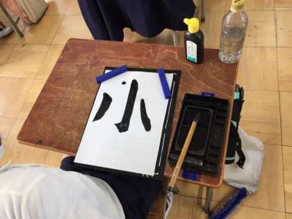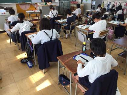 3年生の習字の時間です。みんな集中して「小」の字を書いています。真剣です。
