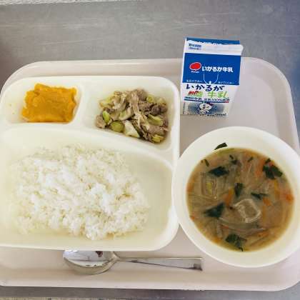 今日の献立は、ご飯、牛乳、豚肉とまいたけの炒めもの、いわしのつみれ汁、かぼちゃういろうでした。