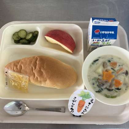 今日の献立は、コッペパン、牛乳、きのこのクリームシチュー、きゅうりのバジル風味サラダ、りんご、マーマレードでした。