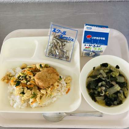 今日の献立は、牛乳、カツ丼、すまし汁、ミニフィッシュでした。