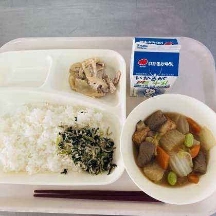 今日の献立は、牛乳、じゃこ菜っ葉ごはん、豚肉のスタミナ焼き、厚揚げと冬野菜のあったか煮でした。