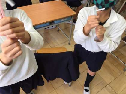 1年生は体育の時間、サッカーをしています。2年生は図画・工作の時間、ストローで人形を作っています。