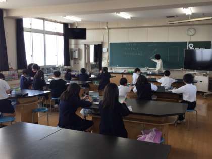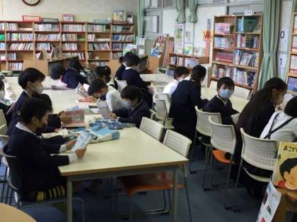 3年生は理科の時間。実験で理科室で勉強しています。4年生は図書の時間。静かに読書をしています。