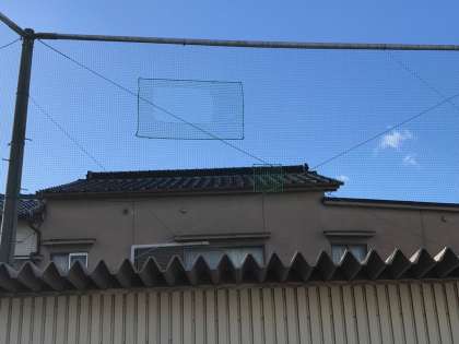 運動場、体育倉庫裏の防球ネットに穴が開いていました。かなり高い所です。3年前の大きな台風の時に、穴が開いているのが分かりました。やっと修理ができました。