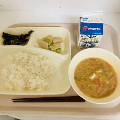今日の献立は、ご飯、牛乳、いわしのしょうが煮、みそ汁、高野豆腐の煮物でした。