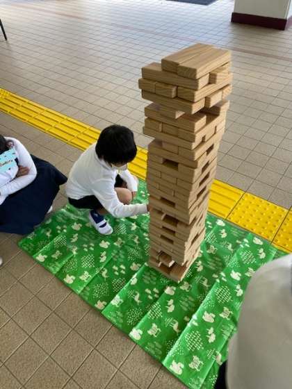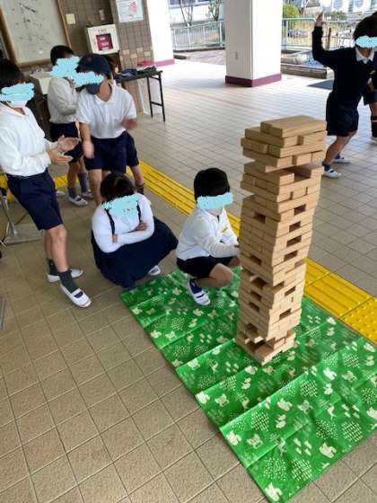 今日は運動場が使用できないので、教室で過ごしたり、ピロティでゲームをする児童が多かったです。ピロティでは大きなジェンガで遊ぶ児童がいました。周りの児童もハラハラしています。