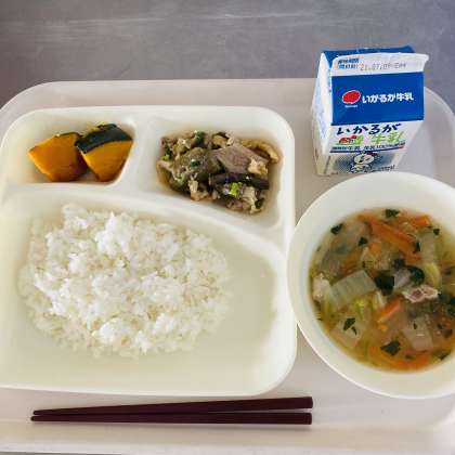 今日の献立は、ご飯、牛乳、豚肉と干しずいきの煮物、うすくず汁、焼きかぼちゃの甘蜜かけでした。