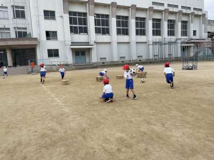 1年生の今年最後の体育の様子です。ボールを蹴ってダンボールに当てて相手陣地に入れたら得点が入ります。一生懸命相手に負けないよう必死になって蹴っています。