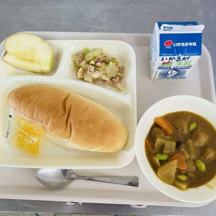 今日の献立は、コッペパン、牛乳、ミートボールと野菜のカレー煮、ツナとキャベツのソテー、りんご、マーマレードでした。