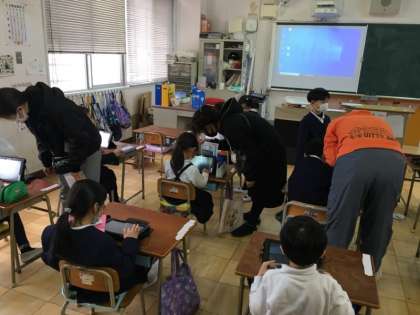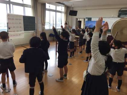 今日の授業の様子です。1年生はタブレットのアップデートの作業をしています。ICT支援員の先生も手伝ってくれています。4年生は理科の実験です。教科書を読んで、これからの実験の確認をしています。2年生の音楽の授業です。太鼓をたたいています。みんなノリノリです。