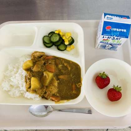 今日の献立は、牛乳、チキンレバーカレーライス、きゅうりとコーンのサラダ、いちごでした。