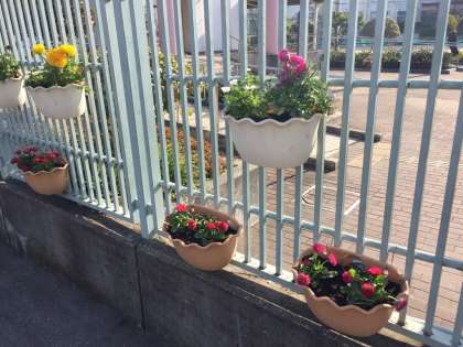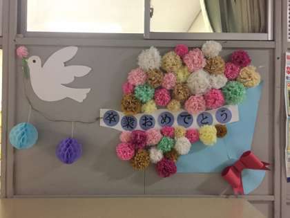 図書館ボランティアのハッピーブックちゃんから、図書館前の掲示板に卒業する6年生へポップを作ってくださいました。地域のなごみクラブ様からは、卒業式向けて、かわいらしい花を送ってもらいました。地域の方々は、卒業をお祝いしてくれています。