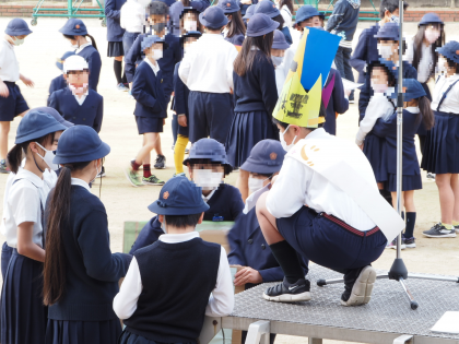 今日は今年度最後の児童集会です。みんなで「王様じゃんけん」をしました。たてわり班のみんなで何を出すか相談をして、王様も相談をして『じゃんけんポン』
