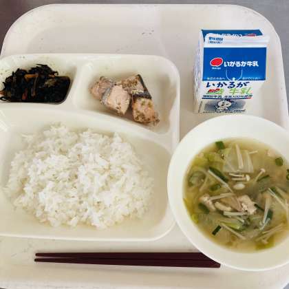 今日の献立は、ごはん、牛乳、さけのごまみそ焼き、五目汁、ひじきのいため煮でした。