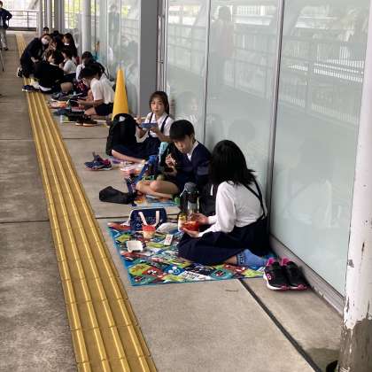 雨が降っているため、少し狭いですが屋根のある場所でお弁当を食べました。