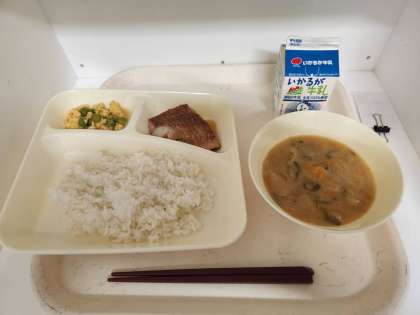 今日の献立は、ご飯、牛乳、赤魚のしょうゆだれかけ、みそ汁、えんどうの卵とじでした。