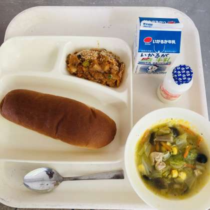 今日の献立は、黒糖パン、牛乳、じゃがいものミートグラタン、スープ、発酵乳でした。