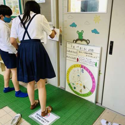 給食後の昼休みに献立ボードを書き換える作業をしています。