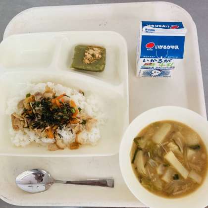 今日の献立は、牛乳、かやくごはん、じゃがいものみそ汁、抹茶ういろうでした。