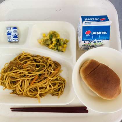 今日の献立は、黒糖パン、牛乳、カレースパゲッティ、レタスとコーンのサラダ、固形チーズでした。