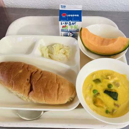 今日の献立は、おさつパン、牛乳、かぼちゃのクリームシチュー、キャベツのゆずドレッシング、クインシーメロンでした。