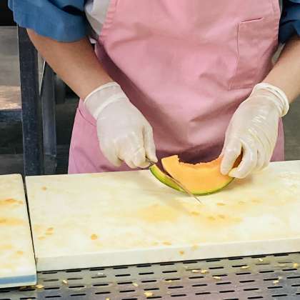 デザートのクインシーメロンは、実と皮の間に切り込みを入れて食べやすくしています。小学校、中学校あわせて約700人分のメロンを切るのは大変ですが、調理員さんが子どもたちのために頑張ってくださいました。