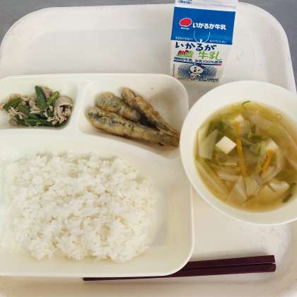 今日の献立は、ご飯、牛乳、いわし天ぷら、五目汁、豚肉と三度豆の炒め物でした。