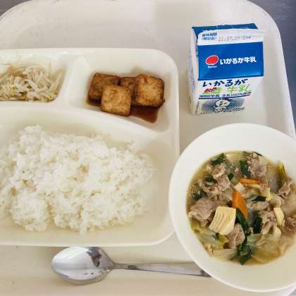 今日の献立は、ご飯、牛乳、中華煮、あつあげのピリ辛じょうゆかけ、もやしの中華あえでした。