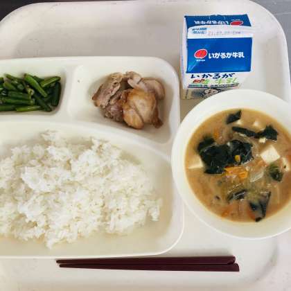 今日の献立は、ご飯、牛乳、鶏肉のしょうゆバター焼き、とうふのみそ汁、三度豆のごまあえでした。