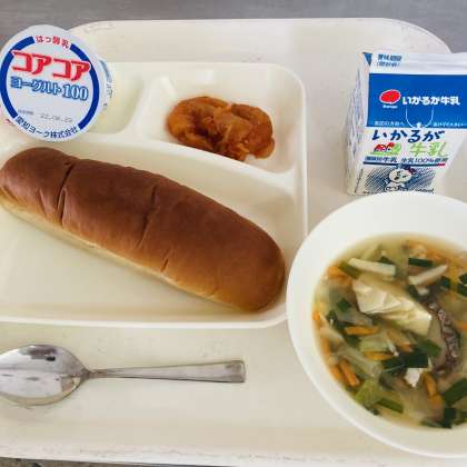 今日の献立は、黒糖パン、牛乳、えびのチリソース、中華スープ、ヨーグルトでした。