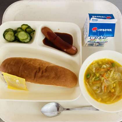 今日の献立は、コッペパン、牛乳、ウインナーのケチャップソース、スープ、きゅうりのサラダ、アプリコットジャムでした。