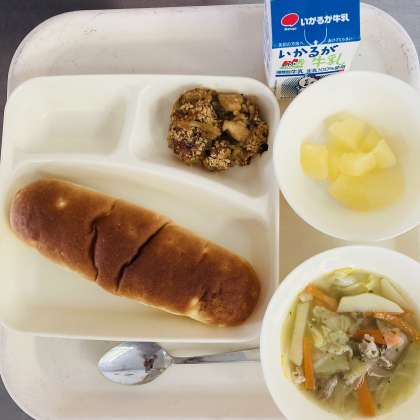今日の献立は、おさつパン、牛乳、カレードリア、豚肉とキャベツのスープ、りんご(カット缶)でした。