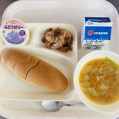 今日の献立は、黒糖パン、牛乳、かぼちゃのミートグラタン、スープ、ぶどうゼリーでした。