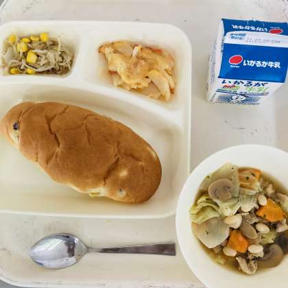 今日の献立は、おさつパン、牛乳、鶏肉とてぼ豆のスープ煮、じゃがいもとトマトのチーズ焼き、もやしとコーンのソテーでした。