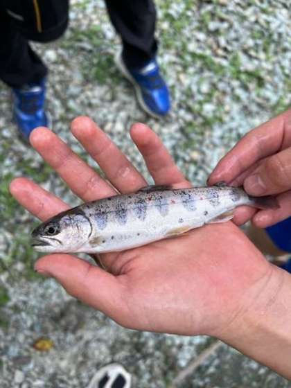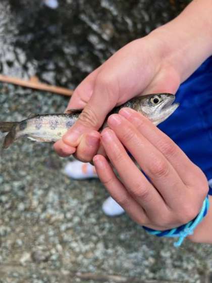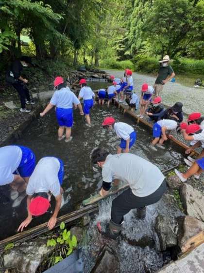足をつけると「冷たい」と言って大阪では経験できない水の冷たさに驚いています。慣れてきたのか魚をつかんだ児童が魚を見せてくれました。このあと焼いて食べると美味しいでしょうね。
