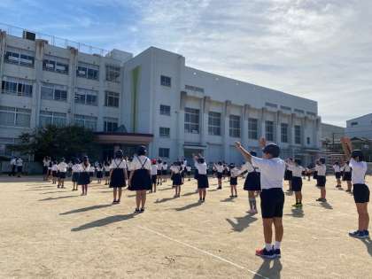 今日の児童朝会は、運動会の練習でラジオ体操をしました。前で体操をした運動委員の児童に合わせて、しっかり体操することができました。