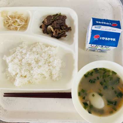 今日の献立は、ご飯、牛乳、プルコギ、トック、もやしの甘酢あえでした。