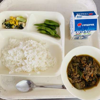 今日の献立は、ごはん、牛乳、マーボーなす、チンゲンサイとコーンの炒め物、枝豆でした。
