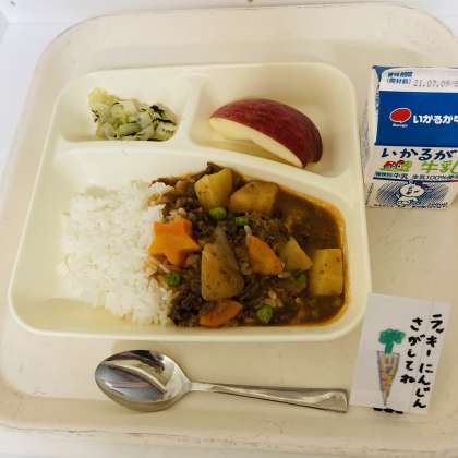 今日の献立は、牛乳、米粉のハヤシライス、キャベツのひじきドレッシング、りんごでした。