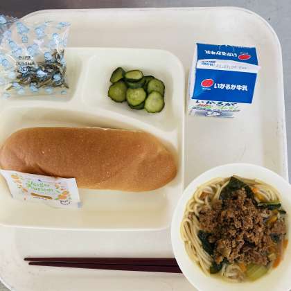 今日の献立は、コッペパン、牛乳、タンタンめん、きゅうりの甘酢づけ、ミニフィッシュ、アプリコットジャムでした。