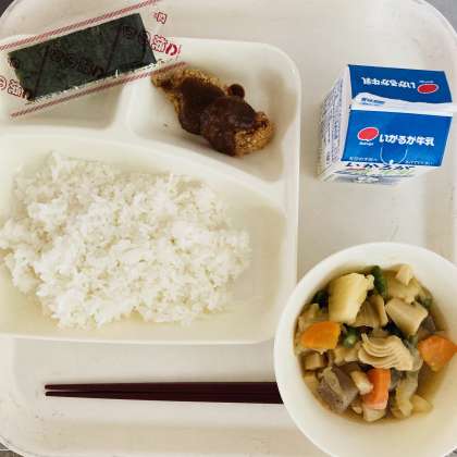 今日の献立は、ご飯、牛乳、みそカツ、じゃがいもと野菜の煮もの、焼きのりでした。