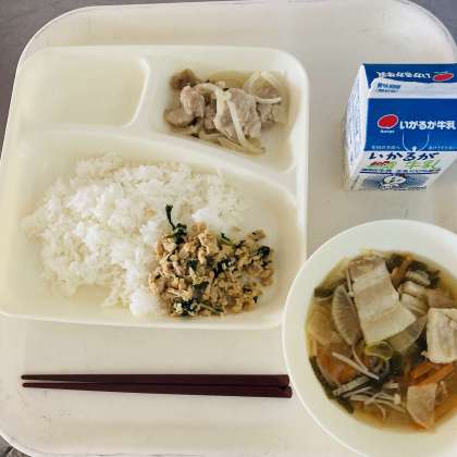 今日の献立は、ご飯、牛乳、鶏肉のゆず塩焼き、ソーキ汁、ツナ大豆そぼろでした。