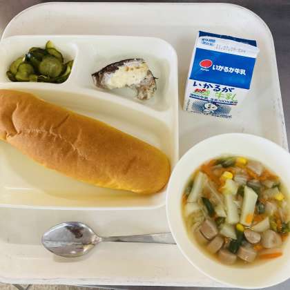 今日の献立は、パンプキンパン、かつおのマリネ焼き、ウインナーとじゃがいものスープ、きゅうりのサラダでした。