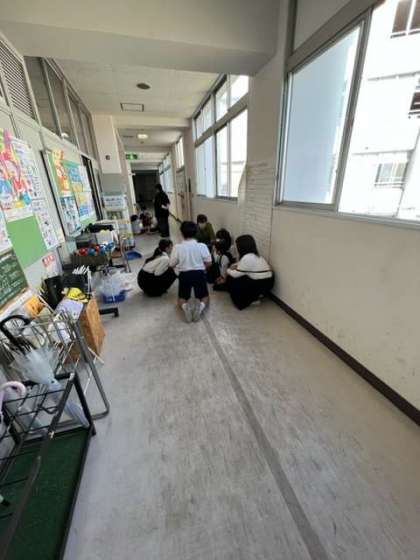 掃除が終わったあとは、高学年が班のメンバーに声をかけ、ふりかえりを行っている。