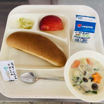 今日の献立は、黒糖パン、牛乳、きのこのクリームシチュー、キャベツのピクルス、りんごでした。