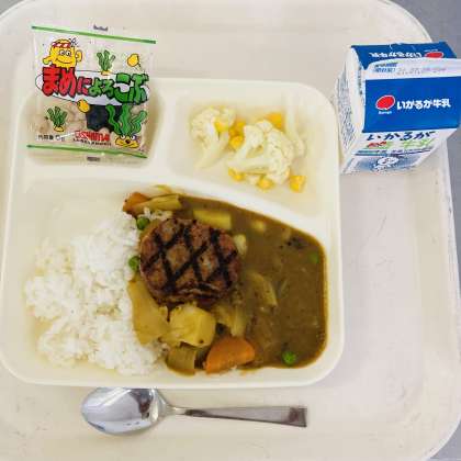 今日の献立は、牛乳、ハンバーグカレーライス、カリフラワーのピクルス、豆こんぶでした。
