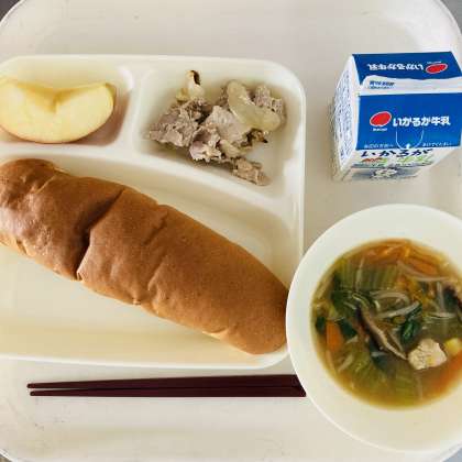 今日の献立は、レーズンパン、牛乳、豚肉のオイスターソース焼き、中華みそスープ、りんごでした。