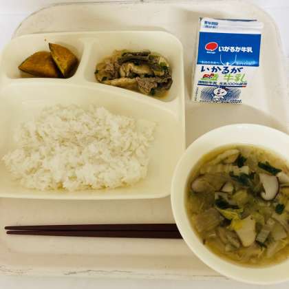 今日の献立は、ごはん、牛乳、豚肉と干しずいきの煮物、うすくず汁、焼きかぼちゃの甘みつかけでした。